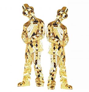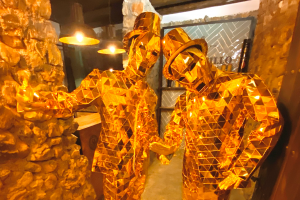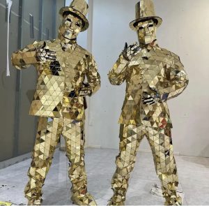 Our golden mirror crew performers are dressed in stunning gold mirror costumes and can create a glamorous and mesmerizing atmosphere.
